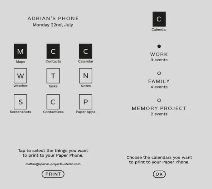 You can pick options and tools that you’ll need throughout the day – like calendar, maps, or contacts – and then print out what’s going to be your physical paper phone for the day. It comes with instructions on how to fold it and even a credit card slot inside.