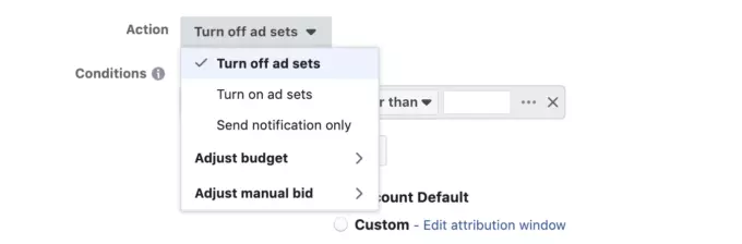 In the action field, you can select to pause, activate, send a notification, adjust budgets or adjust bids.