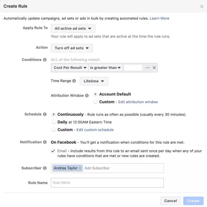 - You can add conditions, such as “cost per result is greater than $50”, with a time range that can be from today all the way to the lifetime of the account.