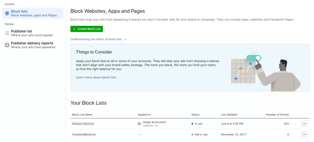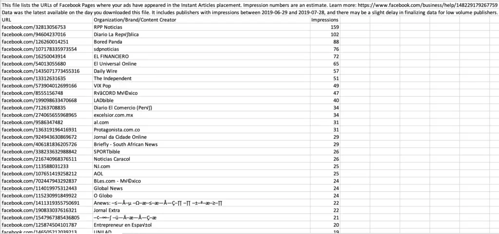 In 2018, Facebook released its Publisher List of thousands of URLs where your ads might appear across the Audience Network, in-stream videos, and banner/interstitial ads. Facebook recommends reviewing this list every 30 days for updates.