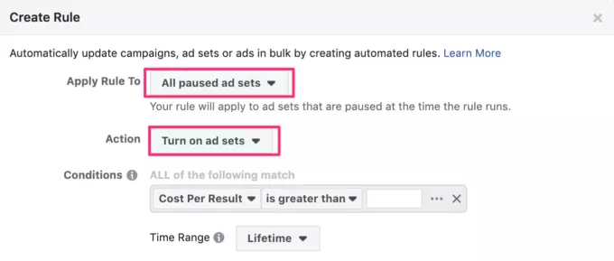 Tip : If you select “Turn on Ad Sets” in the Action field, you’ll see the “apply rule to” field will change to paused campaign, ad set or ad.