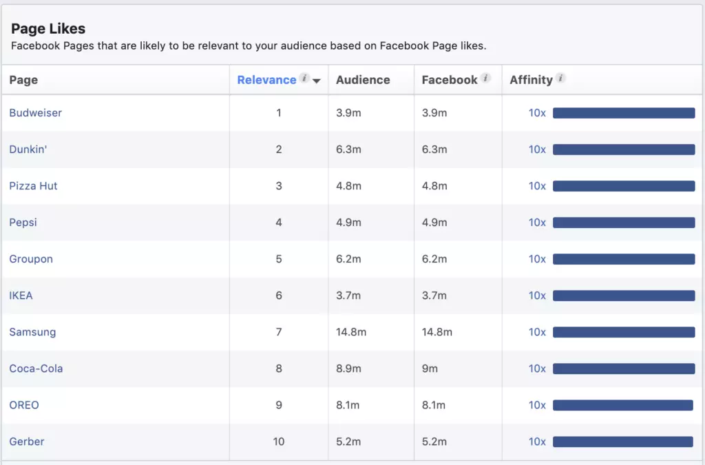 You can also see Pages that are likely to be relevant to your audience based on their interests and how likely your audience is to like these pages (versus the rest of Facebook).