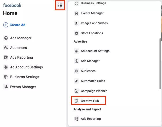 You can find Creative Hub in the Facebook navigation sidebar by clicking the “dot” button and scrolling down to “Advertise” > “Creative Hub”.