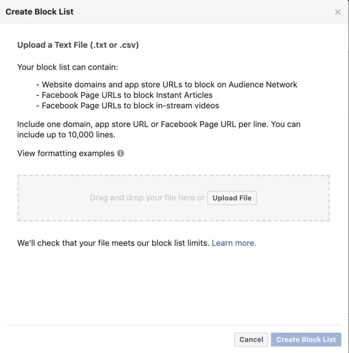 Make sure your list is saved as a .txt or .csv file. Upload it and click “create Block list” to finalize.