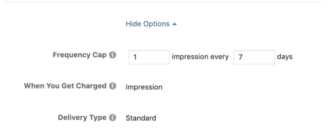 In the Budget & Schedule section of ad set targeting (when using an Awareness campaign), you’ll find a Show Advanced Options button. Once you click this, you’ll see the frequency cap options.