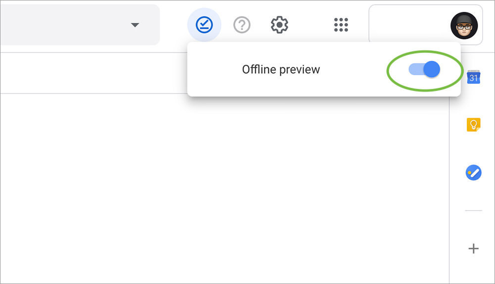 Finally, back on the top of Google Drive main page, click the icon next to the search bar, and toggle “Offline preview” on.