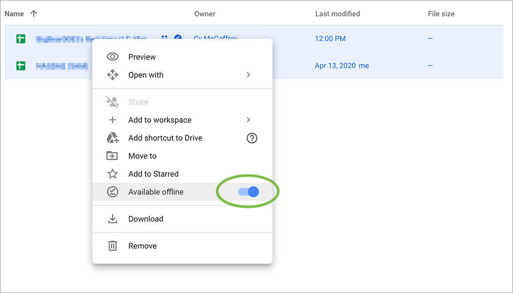 - Back on Google Drive main page, right-click on the files (Docs, Sheets, or Slides) you want to access offline and select “Available offline”. To select multiple files, hold Shift + Command (macOS), or Shift + Control (Windows) while clicking the files.