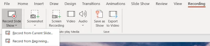 - Click on Recording from the top navigation, and then Record Slide Show .