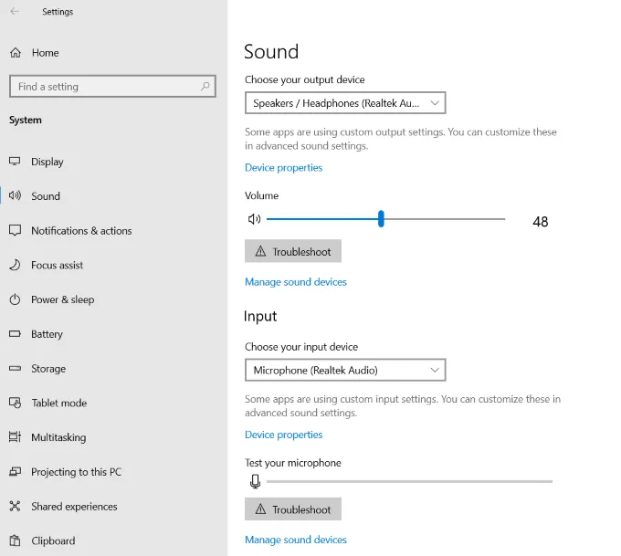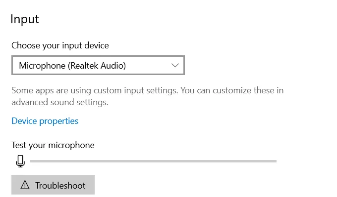 To test your microphone, go back to the Input section. If it’s not working, you can use the Troubleshoot button to try to resolve the issue.