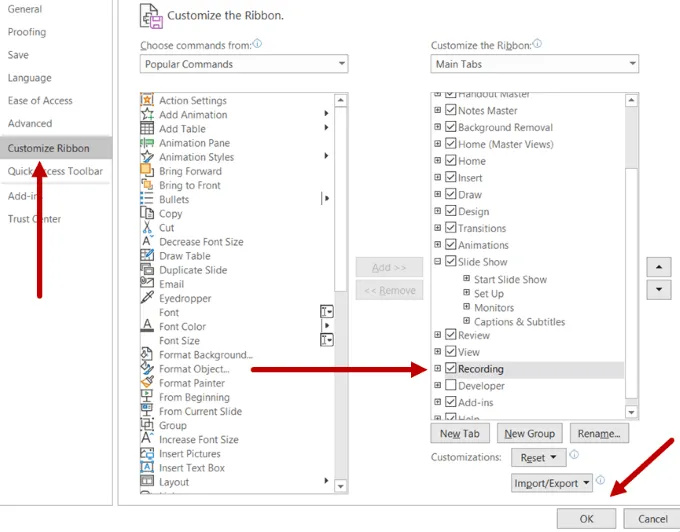 - To turn on the Recording tab, navigate to File , click Options > Customize Ribbon > Recording > OK .
