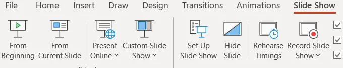 - To preview your slideshow with your narration, animations, and timings (set up before you started recording), click Slide Show from the top bar navigation. Make sure you are on the Home tab.