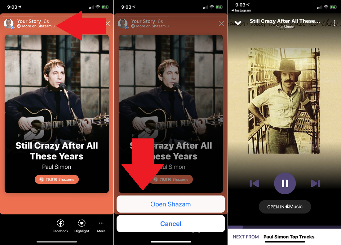 After the story has been published, you can travel back to the Shazam app through Instagram. Open the story in Instagram, tap More on Shazam, then tap Open Shazam to play the song in the app.