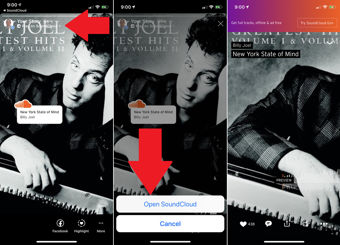 Once the story has been published, it will serve as a link back to the song on SoundCloud. View the story, tap Play on SoundCloud, then Open SoundCloud to open the song in the app.