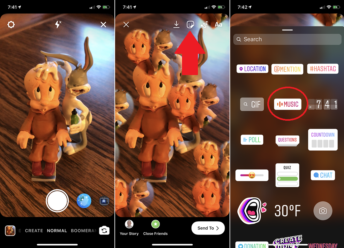 First, we’ll add music directly from Instagram. Tap the camera button or the Your Story icon to start your story. At the camera screen, snap your photo or video. Apply whatever filters or special effects you want. When you’re ready to add a tune to your story, tap the Sticker icon at the top of the screen. Then tap the Music sticker.