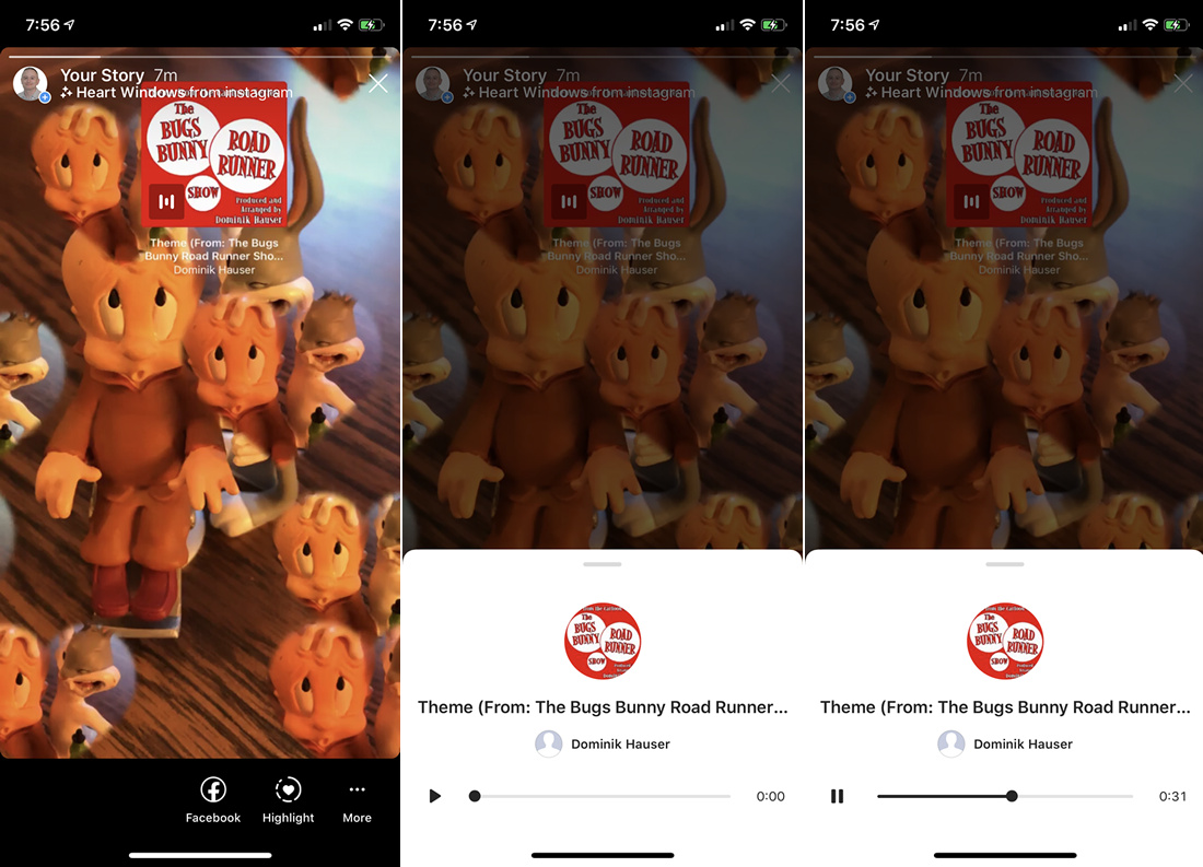To view your story, tap the Your Story icon. Your story appears with the music automatically playing. Tapping the song label pauses the music and brings up a music player with a play/pause button and other options. Your followers can view your story and play the music in the same way.