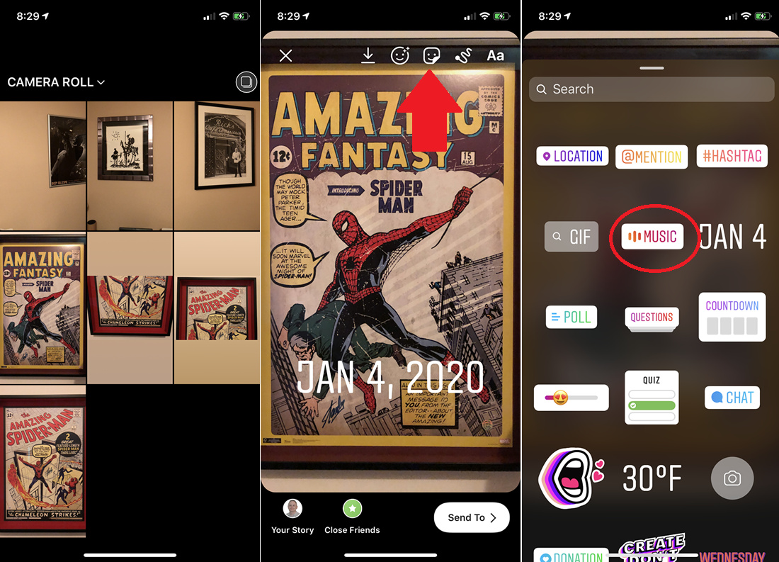 You can also add music to an existing photo or video that you want to use in a story. Tap the camera icon in the upper left. Swipe up to see your photo library. Select the photos or videos you want to add to your story and tap Next. To add music, tap the sticker icon in the toolbar at the top of the screen, then select the Music sticker.
