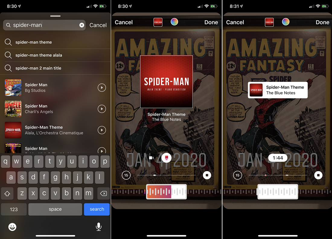 Some songs offer multiple images from which you can choose, and some even offer lyrics that appear on the screen as the music plays. When you’re happy with the image you’ve chosen, tap Done and the song is added to your story in the form of a sticker.
