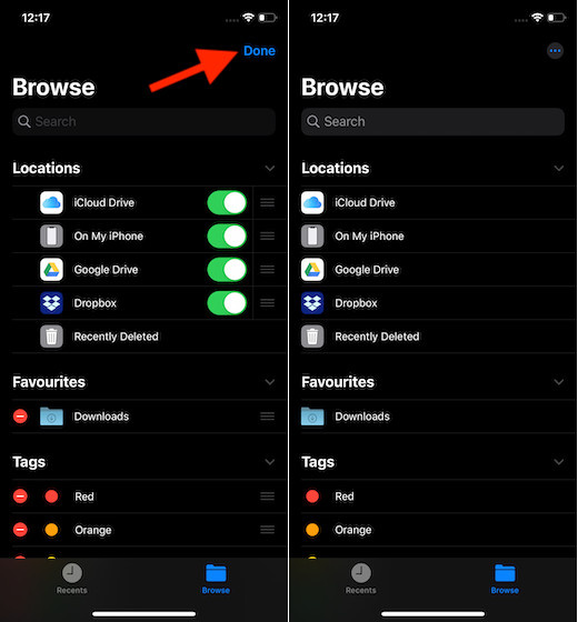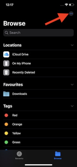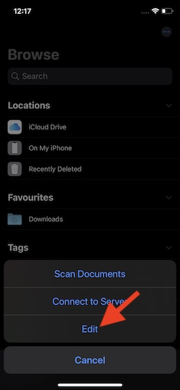 - Open Files app on your device > Browse tab > three dots at the top right > Edit.