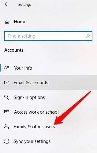 Click Start > Settings > Accounts , choose Family & Other People from the left pane, and select Manage Family Settings Online .