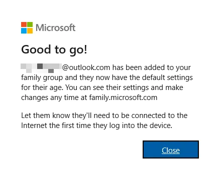 Follow the instructions to create an account for each child. Enter the required information such as email address, password, country and date of birth, and click Next. You’ll get a confirmation that the account has been created. Click Close .