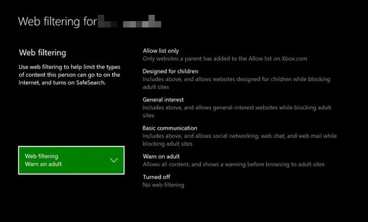 Click the drop-down for more options and select the desired level of web filtering. You can’t add specific websites with web filtering on Xbox One; it can only be added on Windows Family’s Always allowed list.