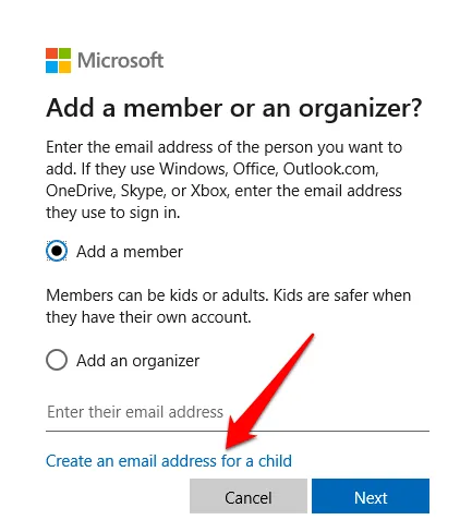 If the child has an email account, enter it in the email field below, and then click Next . If the child doesn’t have an email account, click the Create an email address for a child link and click Next.