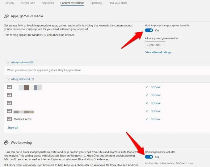 To turn on web browsing limits, click Content Restrictions , scroll down to Web browsing, and switch on/off the Block inappropriate websites settings. If there are specific sites you want always blocked, add their URLs in the Always blocked section.