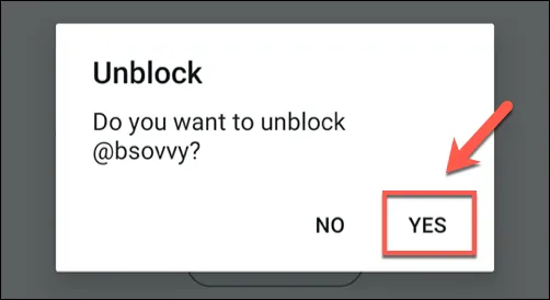 Twitter will ask you to confirm that you do wish to unblock the user’s account. Tap Yes to confirm.