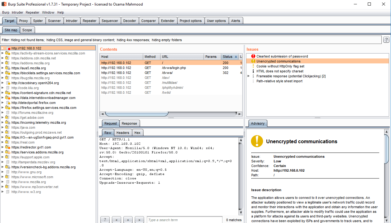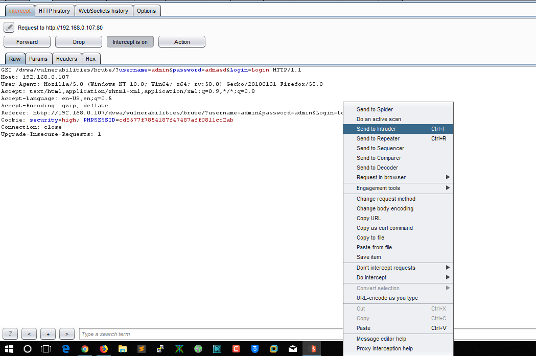 Now go back to the Metasploitable tab and log in to DVWA with username = admin and password = password . In the burp, the site makes sure the Proxy is intercepting the requests.