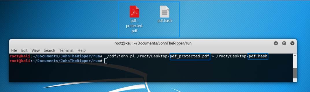 pdf2john.pl /root/Desktop/pdf_protected.pdf > /root/Desktop/pdf.hash