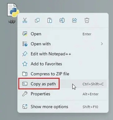 - Now, move to the location where you saved the file (app.py). Right-click on it and choose “Copy as path“.