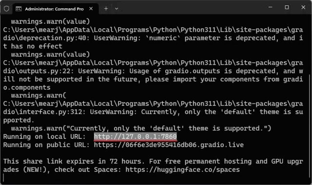 - You may get a few warnings, but ignore them. At the bottom, you will get a local and public URL. Now, copy the local URL and paste it into the web browser.