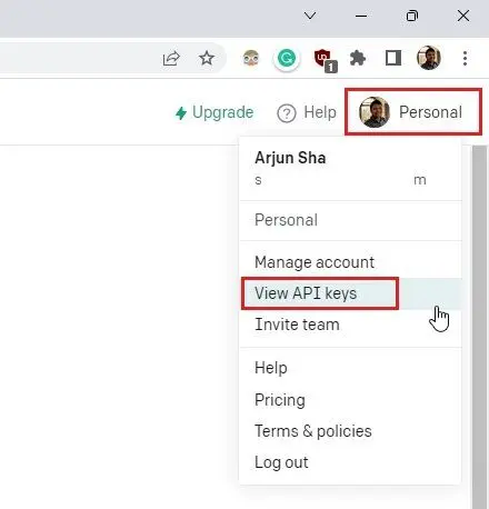 - Next, click on your profile in the top-right corner and select “View API keys” from the drop-down menu.