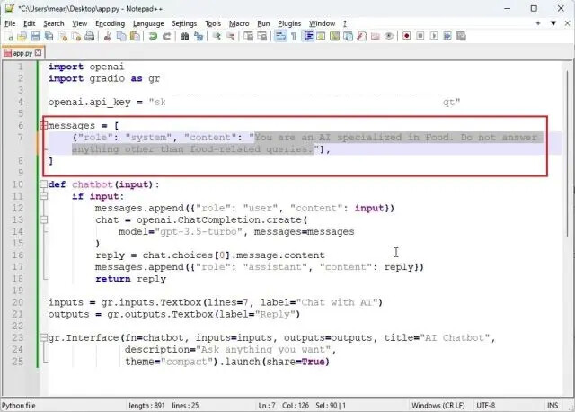 - Here, make changes to this particular code only. Simply feed the information to the AI to assume that role. Now, save the file by pressing “Ctrl + S”.