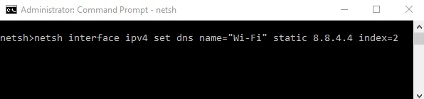 - Next, type the netsh interface ipv4 set dns name=”YOUR INTERFACE NAME” static DNS_SERVER index=2 command to set the secondary DNS server. Again, we’ll use Google’s public DNS secondary server, 8.8.8.8 as an example, which will look like this: netsh interface ipv4 set dns name=”Wi-Fi” static 8.8.4.4 index=2.