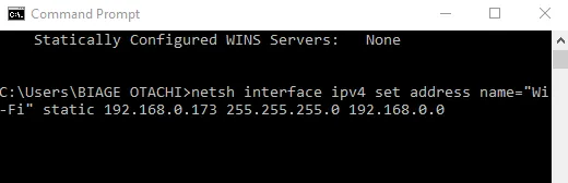 In our example, this command would look like this: netsh interface ipv4 set address name=”Wi-Fi” static 192.168.0.173 255.255.255.0 192.168.0.0