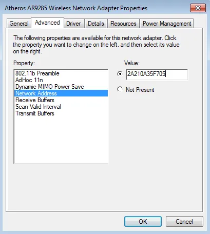 If you want to reset then just select Not Present radio button. You will get reset to your default MAC Address.