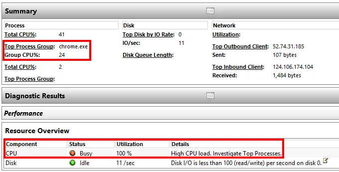 In the report above, Performance Monitor noticed high CPU load from the top process running, which in this case is Google Chrome.