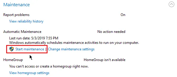 Open Control Panel and go to System and Security > Security and Maintenance . Expand the Maintenance section.