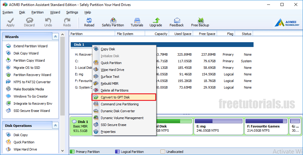 - Right click on your dist & click “Convert to MBR” or “Convert to GPT” (this depends on your current partition style, as i have a MBR partition table, it shows me convert to gpt)