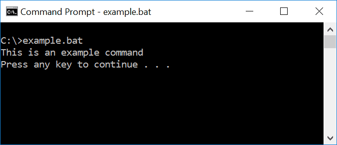 If we run it with example.bat command, we will get the following results. Note that, to run example.bat , we need to open the prompt in the same location where example.bat is. In our case, the file is in C:\ .