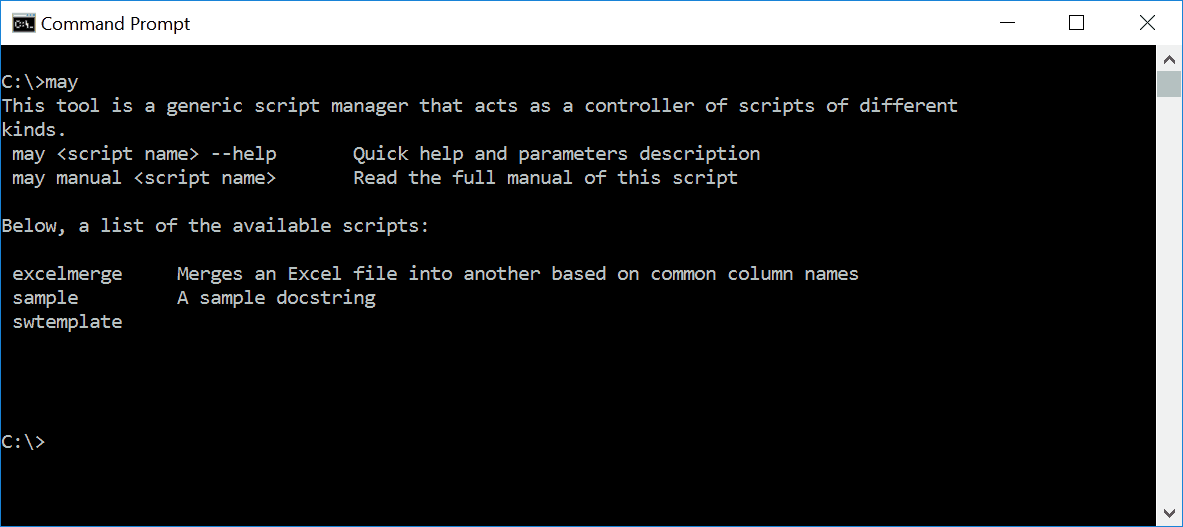 may.batA BAT file to call our Python file, which is the actual scriptmay.pyis our Python script, the code we actually want to execute. In our case, this script will look for python modules in the folder and treat them like commands.