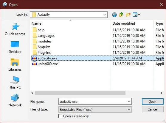 - In our example, we’re going to make a portable version of the free Audacity audio workstation software. With the file browser that pops up, navigate to where the “.exe” file of the app in question is installed.