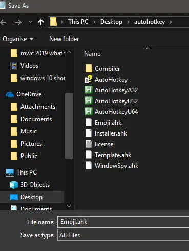 Now, click File in Notepad, then click Save as. Navigate to the directory you extracted Autohotkey. Next, click the Save as type drop-down box and select All files. Now, name it Emoji.ahk and click Save.