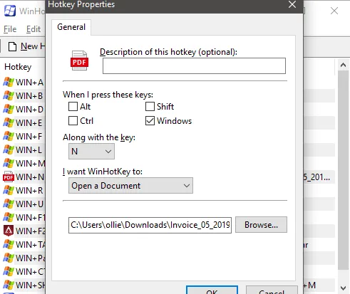 In the new window that appears, give the hotkey a name. After, choose what combination you’d like to trigger the shortcut. For example, I chose to do a Windows+F2. After, you can click the Browse option to find the location of the executable you’d like to open.