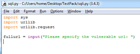 - Now we need to print on the screen to ask the user to enter a vulnerable website to test. It’s very simple. Just follow the below screenshot. Use fullurl = input(“Enter a website to check: “). Input is the Python keyword for printing anything on the screen.