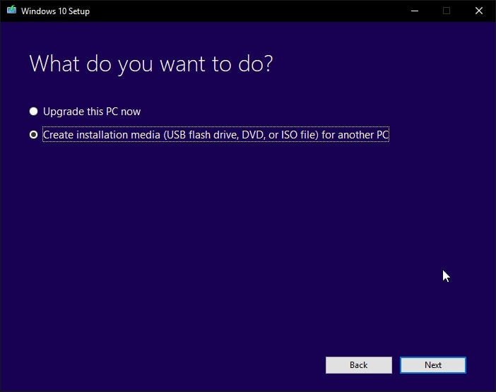 Next, you need to select the option “ Create Installation media (USB Flash drive, DVD, or ISO file) for another PC ” and click “ Next. “