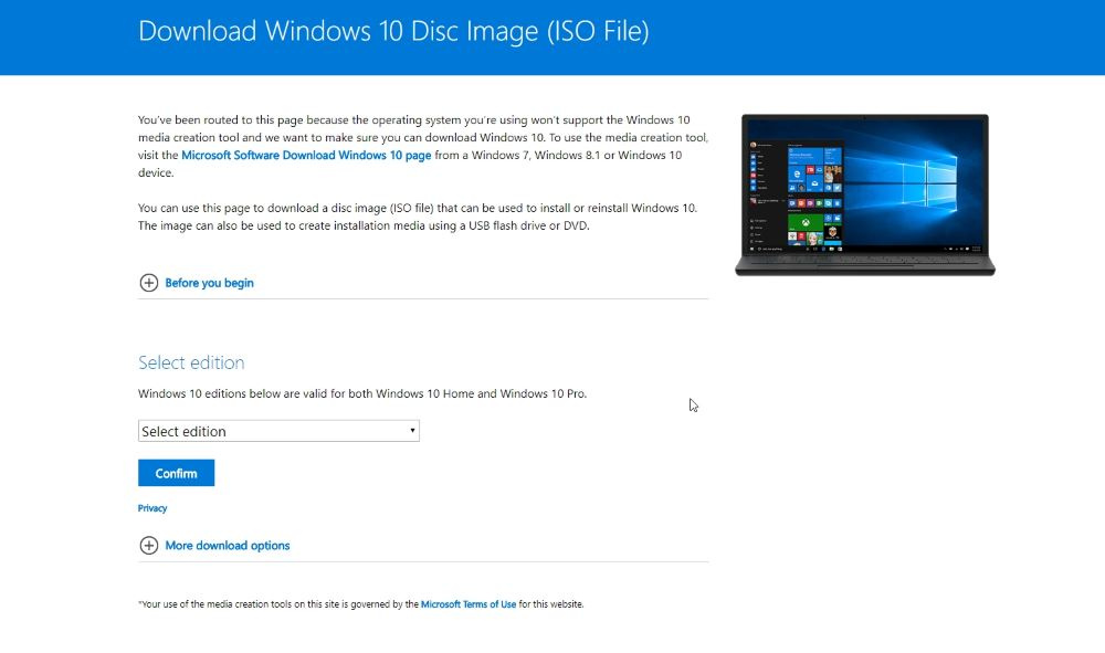 Note: You need to visit the download page from a different OS (Ubuntu, Mac)/ your smartphone / via proxy services like Hide.me – else you will only get the option to download the media creation tool.