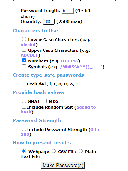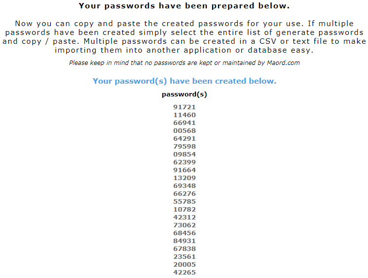 Quantity: Generate number-passwords as many as you want but better choose 100 or 200 ![]()