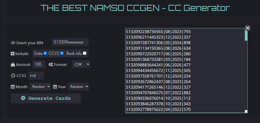 Step 4 : Go to https://www.bestccgen.com/namso-ccgen/ and paste the BIN, generate as you want